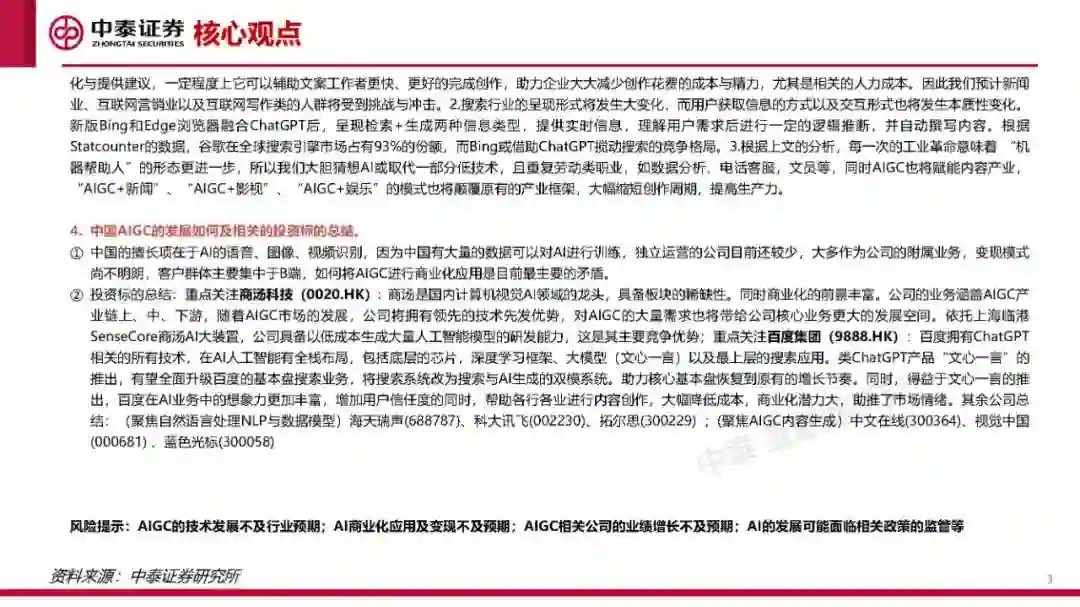 当我们看到微软CEO纳德拉说到“AIGC堪比工业革命”,比尔盖茨评价ChatGPT的历史意义重大,甚至不亚于“PC或互联网诞生”时,我们辩证性地思考这个问题:细数人类社会经历的三次工业革命,第一次以蒸汽机为代表,机械生产取代了双手;第二次以发电机而代表,电器成为补充和取代蒸汽机的新能源;第三次以计算机为代表,促成了各种各样“人-机控制系统”的形成,使得起初的机械化、电气化迈入进阶的自动化。就目前我们看到这三次革命的成果,基本都呈现“机器帮助人”,且存在物理实体的意识型态。不同于前三次,我们有理由猜测第四次工业革命是一个具有前所未有的算力的“超级机器”,它不仅仅可以在体力上协助人类,同时可以在智力上取代人类的部分/全部功能。ChatGPT的出现,从用户体验的角度,仿佛一定程度上触碰到了这个门槛,因为它是那般顺畅,满足了用户大部分的提问需求,且在一分钟内呈现答案。在此之前,AI人工智能早已并不陌生,AlphaGo赢下李世石,但这一次,真正让人们体会到传统的脑力工作者,几乎无法在效率的比拼上赢过机器。ChatGPT的出现,更像是Iphone之于手机市场,以用户最容易上手,接近0教育成本的对话形式,成功打造了爆品。商业社会往往需要成功案例的打造,而ChatGPT在微软生态的火速应用,以及订阅模式的跑通确定了人工智能的可行性,证明了业务模式的有效性和可复制性。从这一点论述,ChatGPT确实具备里程碑式意义。 2.ChatGPT是否足够完美,完美到接近与“自然人”的临界点? 根据我们长时间的使用感受,ChatGPT有它的可取之处:当你需要建议时,它可以提供具有一定新颖性、趣味性的逻辑框架,在内容上启发创造力与灵感,系统性地梳理思路;当你的语句或者文案不够有新意时,它可以赋予句子新的生机,大大减少人们构思写作的时间;当程序员花了大量的时间构思逻辑框架与代码时,由于编程环境中很多功能的写法是有定式的,它可以大大减少这种类型代码的写作时间,为程序员提高生产效率,而程序员可以将更多时间放在理解需求和构建框架上,而节省执行层面的时间。而缺点也较为明显:目前提供的信息并不完全准确,利用概率生成的模型有很大概率存在张冠李戴的情况,通常需要二次确认;它很难做增量信息的知识更新;它只可以做大而全的东西,而无法精确到执行层;同时,ChatGPT的某些回答带有政治、价值倾向性,对用户有一定的误导性,所以在当前的情况下,ChatGPT仍然有很多改进优化的空间。 3.生成式AI如何做商业化变现?它将如何对传统行业进行挑战、升级或是颠覆呢? 我们认为它将挑战文案写作类型的工作,全面升级搜索行业的存在形态,颠覆低技术与内容创造类职业。1.根据上文我们提到,ChatGPT擅长文字美化,细节优化与提供建议,一定程度上它可以辅助文案工作者更快、更好的完成创作,助力企业大大减少创作花费的成本与精力,尤其是相关的人力成本。因此我们预计新闻业、互联网营销业以及互联网写作类的人群将受到挑战与冲击。2.搜索行业的呈现形式将发生大变化,而用户获取信息的方式以及交互形式也将发生本质性变化。新版Bing和Edge浏览器融合ChatGPT后,呈现检索+生成两种信息类型,提供实时信息,理解用户需求后进行一定的逻辑推断,并自动撰写内容。根据Statcounter的数据,谷歌在全球搜索引擎市场占有93%的份额,而Bing或借助ChatGPT搅动搜索的竞争格局。3.根据上文的分析,每一次的工业革命意味着“机器帮助人”的形态更进一步,所以我们大胆猜想AI或取代一部分低技术,且重复劳动类职业,如数据分析、电话客服,文员等,同时AIGC也将赋能内容产业,“AIGC+新闻”、“AIGC+影视”、“AIGC+娱乐”的模式也将颠覆原有的产业框架,大幅缩短创作周期,提高生产力。 4.中国AIGC的发展如何及相关的投资标的总结。 ①中国的擅长项在于AI的语音、图像、视频识别,因为中国有大量的数据可以对AI进行训练,独立运营的公司目前还较少,大多作为公司的附属业务,变现模式尚不明朗,客户群体主要集中于B端,如何将AIGC进行商业化应用是目前最主要的矛盾。