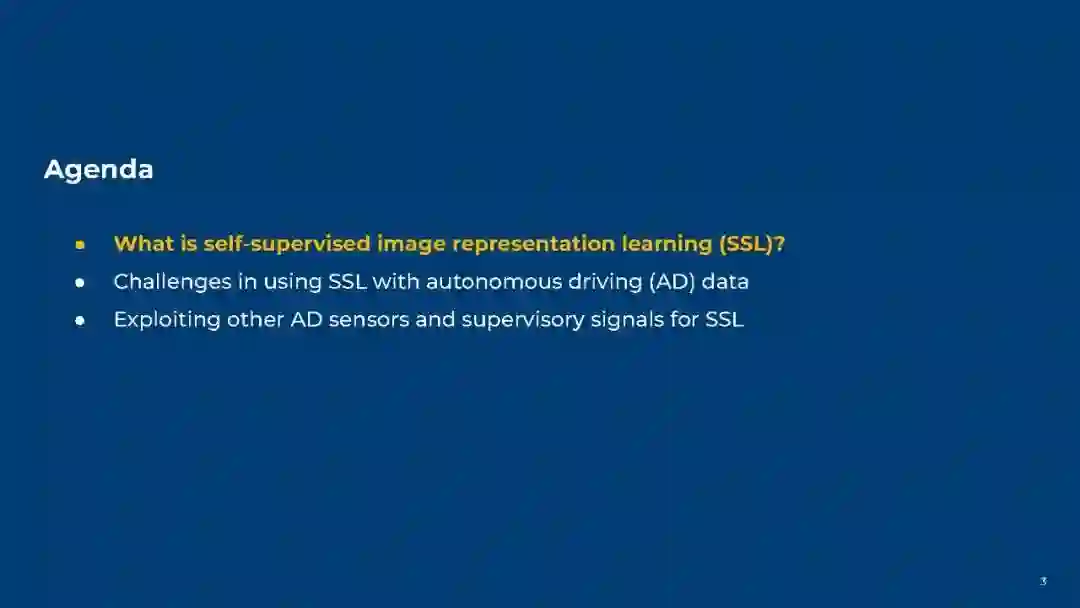基于深度学习的图像理解方法的巨大进展为自主系统提供了新的高级感知功能。然而,现实世界的视觉应用通常需要模型,可以从大量未标记和未策划的数据中学习,只有少量标记样本,通常选择和注释成本很高。相比之下,典型的监督方法需要大量精心选择的标记数据,而在实际应用中很少满足这一条件。自监督学习(SSL)作为一种有前途的研究方向出现,通过使用从数据本身提取的各种监督信号训练模型,而不需要任何人工生成的标签,来缓解这一差距。SSL在过去两年中取得了许多令人兴奋的进展,许多新的SSL方法设法达到甚至超过完全监督技术的性能。虽然最流行的SSL方法围绕着ImageNet等网络图像数据集,但也对自动驾驶(AD)的新多样的自监督形式进行了研究。AD代表了SSL方法的一个独特沙箱,因为它带来了社区中最大的公共数据集合,并提供了一些最具挑战性的计算机视觉任务:目标检测、深度估计、基于图像的里程测量和定位等。在这里,规范的SSL通道(即自监督预训练模型并在下游任务上对其进行调优)被重新访问和扩展,以学习地面真相注释难以计算的任务(例如,密集深度),从而为计算机视觉和机器人技术带来全新的SSL方法。在本教程中,我们将通过AD的基本感知任务的镜头,深入介绍自我监督学习的各种范式(旧的和新的)。具体来说,本教程将涵盖以下主题:(1)从自动驾驶数据中进行自我监督表示学习,(2)深度估计的自监督学习,(3)三维检测和跟踪的自监督学习,(4)里程数测量和定位的自监督学习。