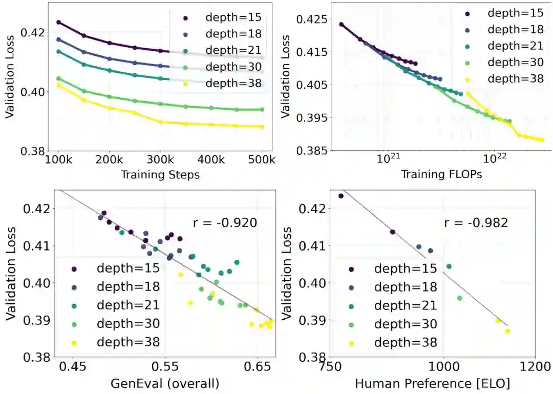 作者利用重新加权的 Rectified Flow 公式和 MMDiT 骨干对文本到图像的合成进行了扩展(scaling)研究。他们训练的模型从带有 450M 个参数的 15 个块到带有 8B 个参数的 38 个块不等,并观察到验证损失随着模型大小和训练步骤的增加而平稳降低(上图的第一行)。为了检验这是否转化为对模型输出的有意义改进,作者还评估了自动图像对齐指标(GenEval)和人类偏好分数(ELO)(上图第二行)。结果表明,这些指标与验证损失之间存在很强的相关性,这表明后者可以很好地预测模型的整体性能。此外,scaling 趋势没有显示出饱和的迹象,这让作者对未来继续提高模型性能持乐观态度。