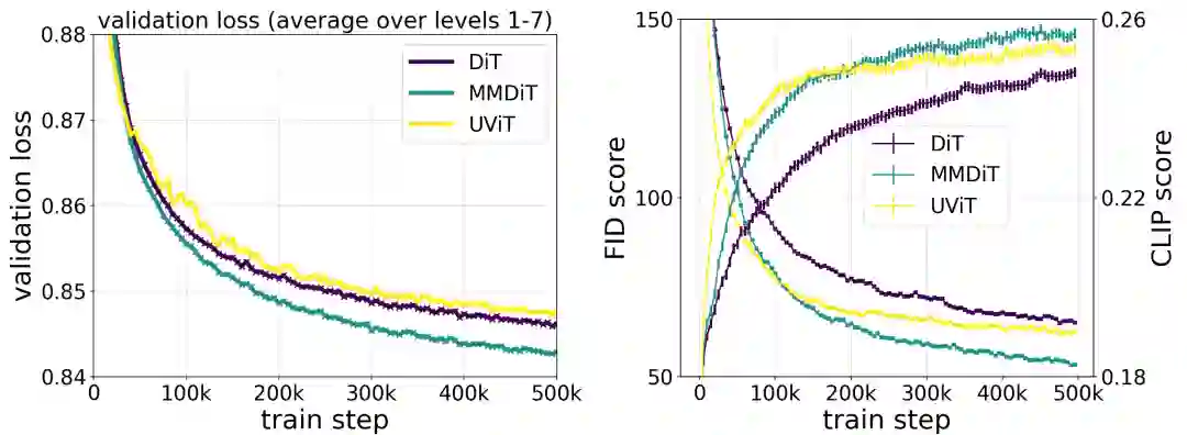 在训练过程中测量视觉保真度和文本对齐度时,作者提出的 MMDiT 架构优于 UViT 和 DiT 等成熟的文本到图像骨干。