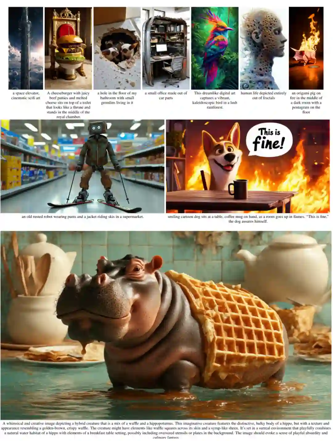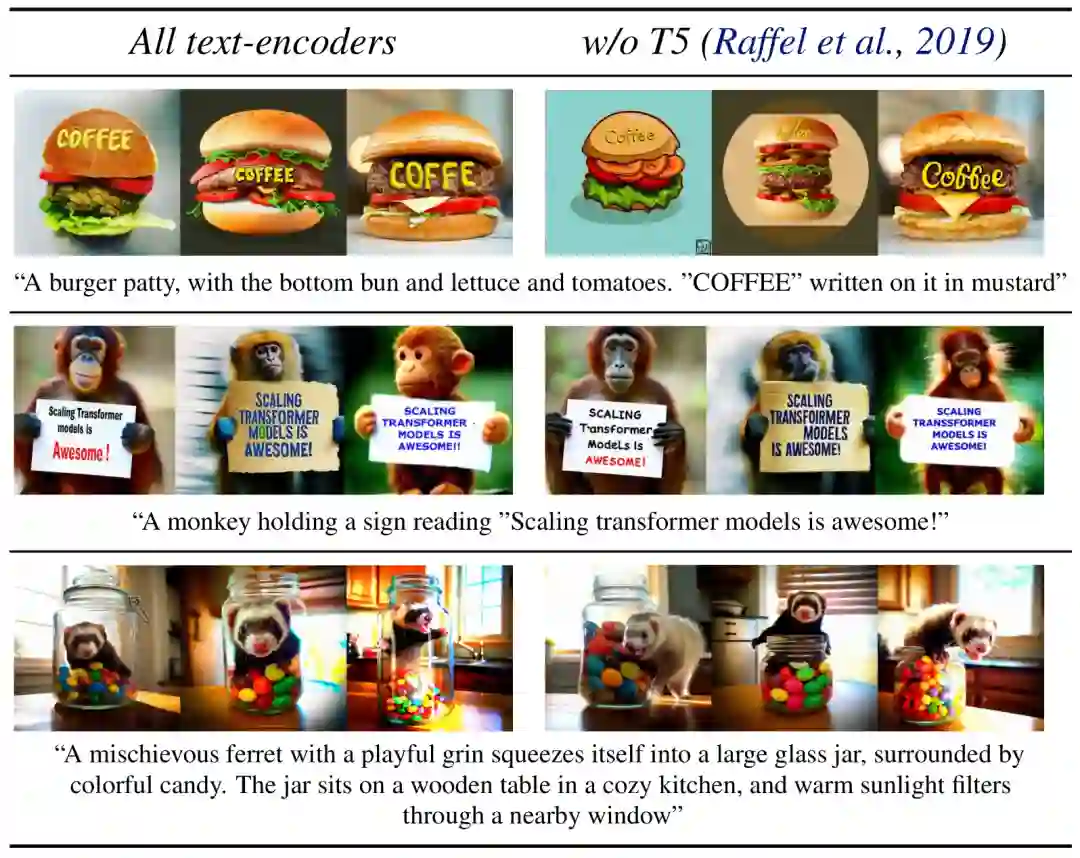只有在呈现涉及许多细节或大量书面文本的非常复杂的提示时,移除 T5 进行推理才会导致性能显著下降。上图显示了每个示例的三个随机样本。