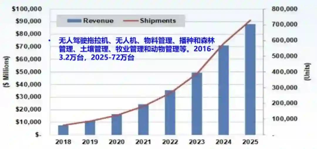 在当前疫情背景下,农业机器人发展更快。图1所示的是Tractica对农业机器人的收入和出口全球市场预测,由图1可见,2025年农业机器人将达到879亿美元,有72万台农业机器人会投入到生产实践中。