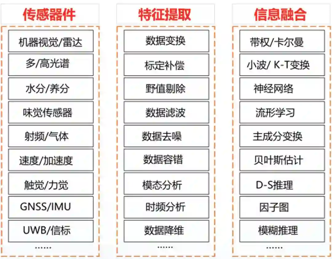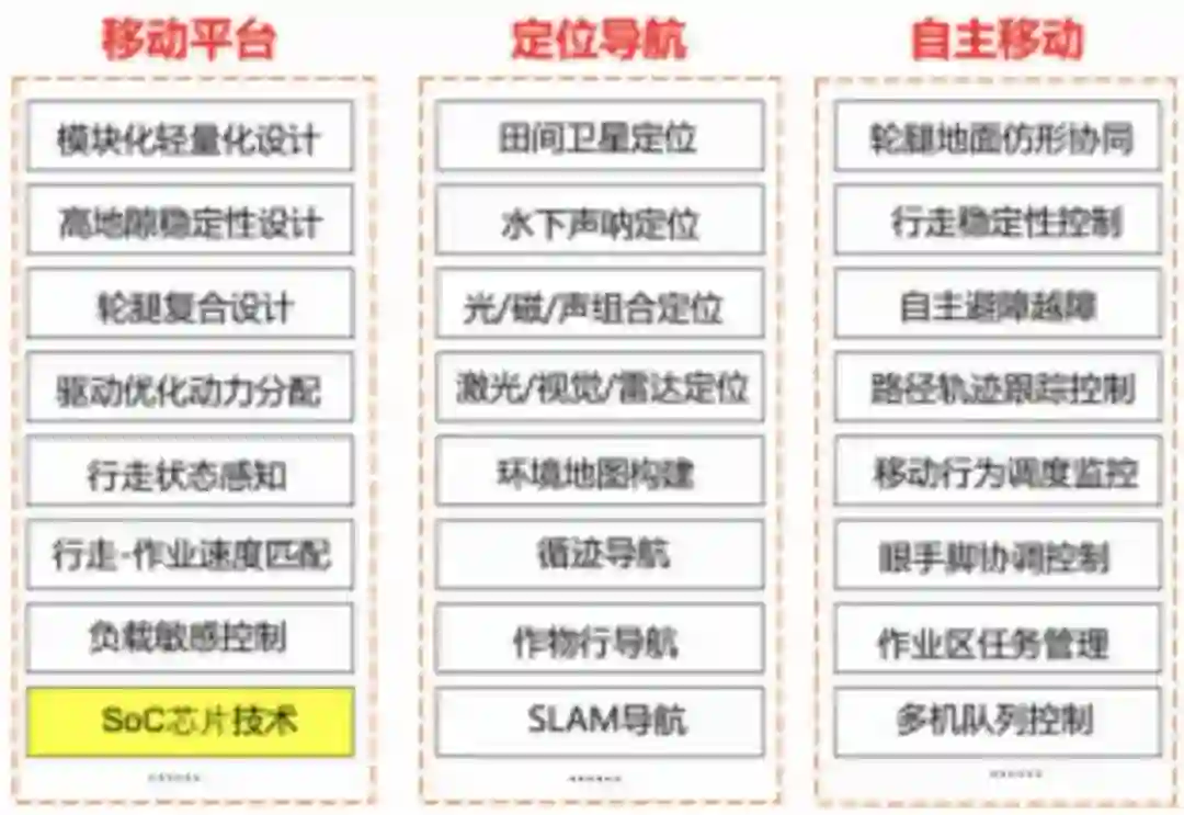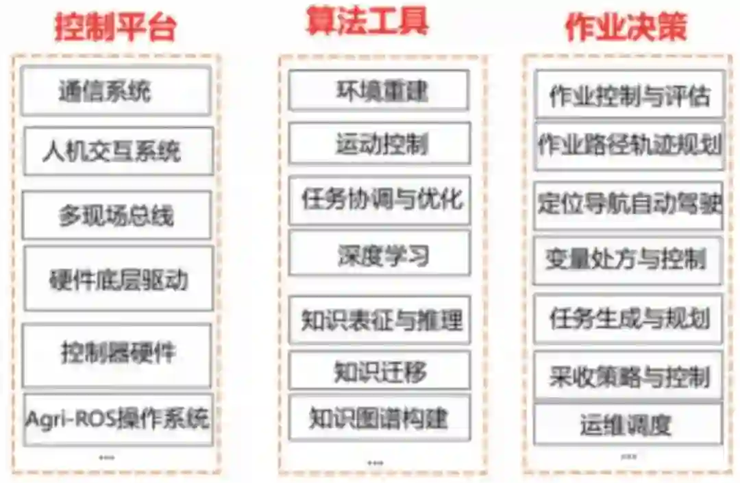 通过人工智能的深度学习、核心算法,提高农业机器人的感知能力和决策能力,特别是使用深度学习方法和技术对表型特征、场景和作物病害等进行识别,优化运动路径、作业姿态和作业次序等。研究触觉反馈控制增强农业机器人感知、执行能力,防止采摘农产品过程中,末端执行器夹持力太大对产品商品品质的破坏。人机共融可以提高作业效率,可以使机器的智能达到极大的提升,大幅度降低成本,这是解决当前面临复杂场景条件下,进一步提高机器质量的方法手段。多智能体理论有望提升农业机器人协同作业效率,因为多智能体的自主性、分布性和协调性特点,有利于最大化农业机器人空地协同、多机协同效能。多机器人协同作业,多个机器同时完成共同的一个任务,如果一个机器人发生问题,其他机器人可以继续完成任务。多臂并行作业可以提高采摘机器人效率,如美国Harvest Croo草莓采摘机器人、西班牙Agrobot 草莓采摘机器人采取的就是这种方式。多臂并行作业虽然能够大幅提高采摘机器人作业效率,但也面临农艺流程改进、供电/控制等辅助设备庞杂,以及多臂间的任务协调分工与规划等问题。新材料的研究可以改善农业机器人执行能力,如目前纳米材料、复合材料、3D打印都可以助力未来农业机器人的发展。未来农业机器人创新研究重点如下所述。