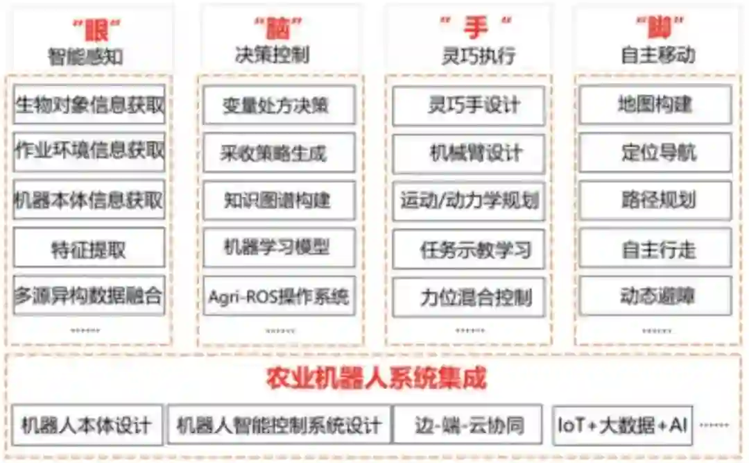农业机器人(Agribot)维基百科的定义为可用于农业生产活动的机器人。农业机器人我们从最朴素的角度去理解,是指用于农业生产,具有感知、决策、控制与执行能力的多自由度自主作业装备,主要包括信息感知系统、决策控制系统、作业执行机构和自主移动平台,也即“ 眼、脑、手、脚”。信息感知部分基于视觉、触觉、听觉、味觉技术的空间环境、靶标位置与形态等多模态信息感知系统 (人的五官) ;决策控制部分体现在机器脑,以及对象识别、场景分析、路径判断和任务规划 (人的脑);作业执行部分体现在高效鲁棒机器人专用驱动及末端执行机构 (人的手脚)。工程实际应用中,农业机器人与人工智能、大数据、云计算、物联网结合,构成了农业机器人应用系统,丰富了农业机器人概念的内涵与外延。