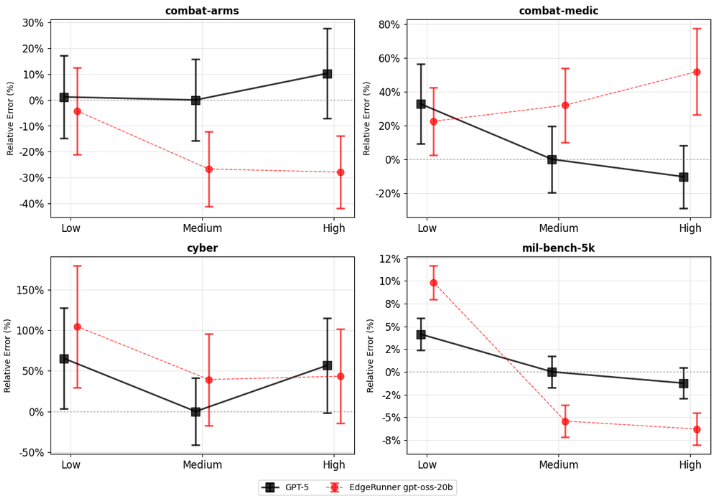 两年前普遍认为受边缘硬件算力、内存与功耗限制,在商用设备实现GPT-4级性能绝无可能。EdgeRunner人工智能突破这些限制——完全在终端设备实现GPT-5级能力——成为全球首个在军事及"拒止、降级、间歇与受限"(DDIL)场景投入应用的系统。推出EdgeRunner 20B模型,该模型由EdgeRunner AI团队研发,在四项军事测试集达到GPT-5任务性能,并可在边缘设备完全物理隔离环境下运行。这些成果验证了核心论点:通过深度军事定制化,能够将基础模型参数量从数千亿乃至数万亿压缩至200亿量化参数以下,同时保持对作战人员关键能力的任务性能不衰减。