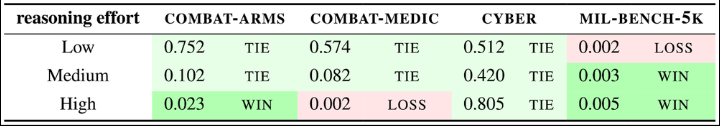 经与GPT-5对比发现,除个别双向异常值外,模型在军事任务性能上可比肩GPT-5,同时具备可在用户本地设备运行的轻量化特性。最新GPT模型支持用户配置推理强度参数以控制答案生成前的思考时长。