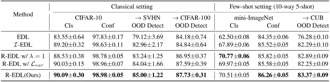 的MSE损失的积分的优点。通过弃用最小化方差的正则项来放宽EDL优化目标已被证明可以缓解过度自信问题。 * 在多个不确定性估计任务上进行了广泛实验,包括置信度估计和分布外检测,全面展示了我们提出的 R-EDL 的有效性,并在经典、小样本、带噪等设置下表现出显著的性能。