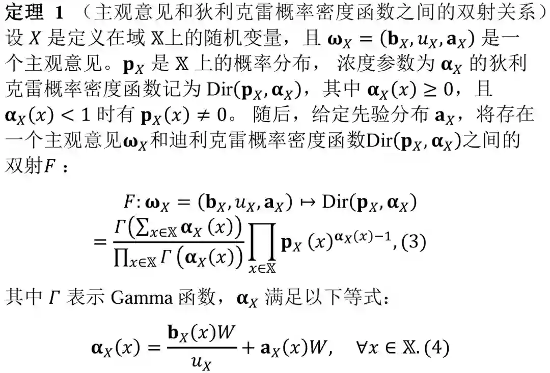 此外,主观逻辑理论指出,如果给定先验分布和称为先验权重的参数W,则多项式意见与狄利克雷概率密度函数之间存在双射。这种关系源于通过概率密度解释二阶不确定性,并在主观逻辑中发挥重要作用,因为它提供了利用概率密度函数的计算推理方式。