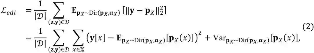 . 为了进行模型优化,EDL假设类概率服从双射中指定的狄利克雷概率密度函数,并整合了传统的均方误差损失函数,从而得出等式2所示的优化目标。在推理中,EDL利用投影概率(参见定义2)作为预测得分,并使用等式5计算分类不确定性作为不确定性质量