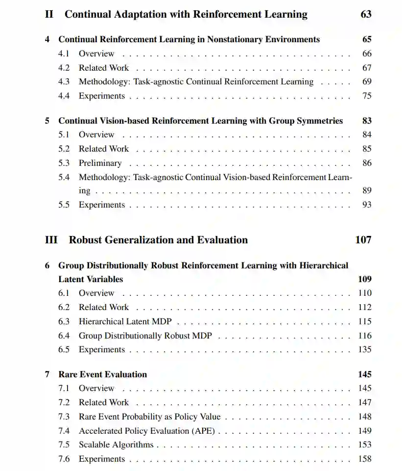 第六章我们考虑了任务估计不确定性下的鲁棒性。我们提出了GDR-MDP框架,能够利用丰富的分布信息,包括关于任务群的自适应信念和先验知识。据我们所知,GDR-MDP是第一个在自适应环境下建模信念估计不确定性的分布鲁棒MDP框架。我们理论上展示了GDR-MDP的分层潜在结构如何相比于平坦任务结构增强其分布鲁棒性。我们还通过实验证明,我们提出的群分布鲁棒训练方法在面对现实场景中的信念推断错误时生成的策略比基准更鲁棒。我们希望这项工作能激发未来关于不同领域知识如何影响鲁棒性和泛化的研究。一个令人兴奋的未来方向是将群分布鲁棒训练扩展到高维和连续潜在任务分布,以应用于各种决策应用。