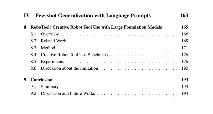 第八章我们介绍了RoboTool,一个由大型语言模型(LLM)驱动的创造性机器人工具用户,使其能够解决具有隐含物理约束的长时间规划问题。RoboTool包含四个组件:(i)“分析器”,识别与任务可行性相关的关键概念,(ii)“计划者”,生成创造性工具使用计划,(iii)“计算器”,计算技能参数,以及(iv)“编码器”,生成可执行代码。我们提出了一个基准来评估三种创造性工具使用行为,包括工具选择、顺序工具使用和工具制造。通过在创造性工具使用基准上的评估,我们展示了RoboTool能够识别正确的工具,生成精确的工具使用计划,并创造新工具完成任务。我们将我们的方法与四种基准方法进行了比较,展示了当所需任务需要精确和创造性工具使用时,RoboTool表现优越。