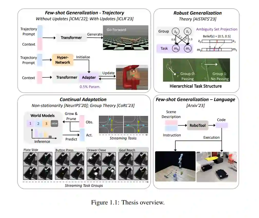 为了弥合训练与现实世界部署之间的差距,本论文认为适应性与可扩展性同样重要,以增强泛化能力。论文探讨了在部署时能够有效适应的通用机器人的构建方法,重点关注数据效率、参数效率和鲁棒性。论文研究了在不同测试时监督下的各种自适应学习策略,包括依赖少量示范的上下文机器人学习、利用奖励信号发现机器人任务结构的无监督持续强化学习,以及将大型基础模型整合用于具身代理。这些方法展示了巨大的潜力,使机器人能够在不同环境中学习新的运动技能,并通过创造性地使用工具解决复杂的长时间任务。论文的组织结构如下所示。 论文的第一部分深入探讨了少样本泛化,特别是从单一示范中学习目标任务。这部分的独特之处在于探索数据稀缺的情境,其中存在足够的训练任务数据,但仅有有限的测试任务示范。这些示范可能来自各种来源,包括人类专家、脚本策略、学习的迁移模型或网络数据。我们提出的解决方案利用了Transformer架构的序列建模能力和丰富的训练任务数据,来建模机器人策略与任务之间的对应关系。 第二部分重点转向持续适应,其中目标任务是在没有先前示范的情况下实时解决。这种情境与持续强化学习(RL)一致,特点是非平稳环境和不断变化的任务。我们的目标是高效学习新的序列决策任务,尽量减少环境交互。为此,我们引入了任务无关的在线学习算法,通过高斯过程表示每个动态模型或通过等变神经网络捕捉几何相似性。 论文的第三部分集中于决策算法的鲁棒泛化和评估。前几部分使用了一种主要评估来自均匀任务分布的目标任务样本平均性能的指标。考虑到现实世界中的机器人应用通常是高风险的,我们在第三部分研究了两个以安全为中心的指标。第一个指标在解决从目标任务分布中抽取的任务时检查最差性能。第二个指标探讨稀有事件概率,特别是在长尾目标任务分布的背景下,提供了一个超越简单平均性能指标的全面而细致的评估框架,用于评估可泛化的机器人学习。 论文的第四部分受到最近大型基础模型成功的强烈启发。我们探索了如何使用大型基础模型通过创造性的工具使用行为解决多种物理难题。我们介绍了RoboTool,一个促进三种不同类型创造性工具使用的系统:工具选择、顺序工具使用和工具制造。该系统适用于两种不同的机器人形式:机械臂和四足机器人。RoboTool利用大型语言模型的上下文学习能力来掌握基本的物理概念,制定基于文本的行动计划,并将这些计划转换为可执行的Python脚本。 论文组织结构: