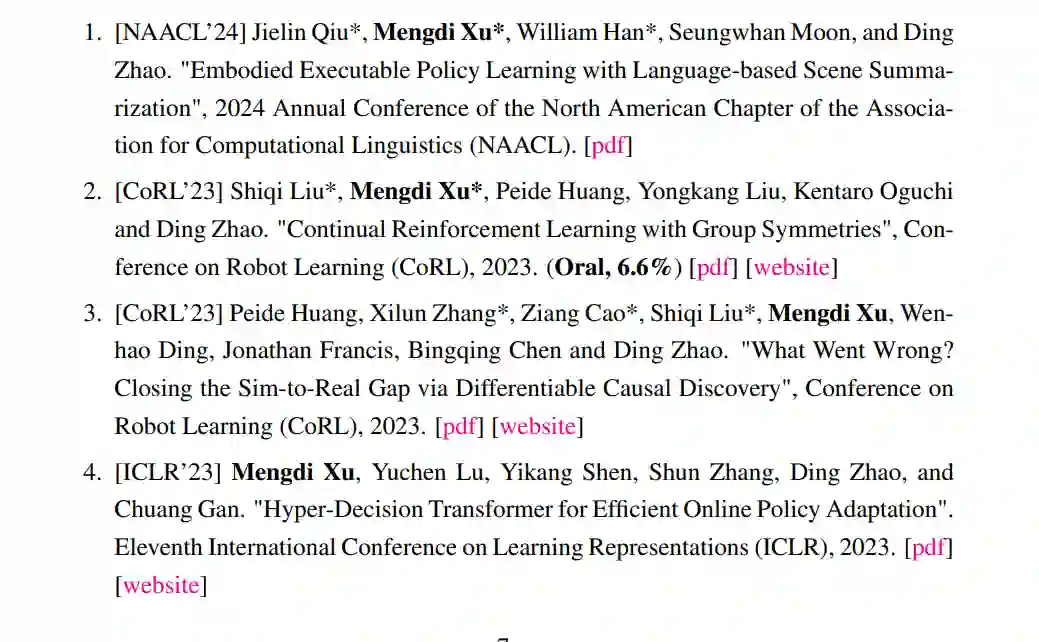 现实中,机器人不可避免地会遇到新的任务。例如,家用机器人必须操作未见过的物体或完成具有新组成部分的长时间烹饪任务(Kipf et al., 2019; Kirk et al., 2023)。而自动驾驶车辆则必须与具有显著不同行为的未知人类驾驶员安全互动(Sadigh et al., 2016; Shalev-Shwartz et al., 2016)。这种现实且高度不确定的场景对机器人学习算法提出了重大挑战,并在大规模部署机器人之前需要强大的泛化能力。鉴于这些现实问题,我的研究愿景是开发能够在类似日常生活的挑战性新环境中泛化的机器人。