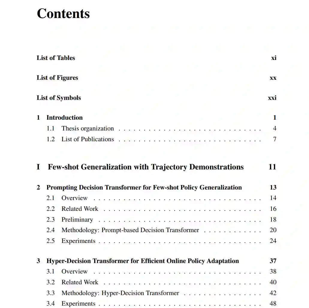 第三章提出了超决策Transformer(HDT),一种能够以高数据和参数效率泛化到新颖任务的Transformer代理。在微调过程中,HDT对每个Transformer块引入适配层进行微调,这仅占预训练Transformer代理0.5%的参数。我们展示了在包含精细操作任务的Meta-World基准中,HDT比使用专家动作微调整个Transformer代理收敛更快。此外,HDT通过使用超网络预训练适配层参数显示出强大的数据效率。当专家动作不可用时,HDT在成功率方面远超基准。我们将其强大表现归因于适配层的良好初始化,这帮助HDT迅速实现成功的在线展开。我们希望这项工作能激励未来关于如何优化微调大型Transformer模型以解决下游新任务的研究。一个有趣的未来方向是扩展HDT以处理具有高维自我中心图像输入的具身AI任务。