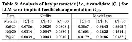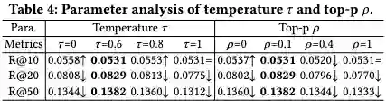 温度参数 影响文本的随机性。较高的值(>1.0)增加多样性和创造性,而较低的值(<0.1)导致更加聚焦。LLMRec使用 从集合 中选取。如表所示,增加 起初提高了大多数指标,随后出现下降。Top-p抽样根据由顶部参数 确定的阈值选择标记。较低的 值优先选择可能的标记,而较高的值则鼓励多样性。LLMRec使用来自集合 的 值,较小的 值往往产生更好的结果。LLMRec使用 来限制基于LLM的推荐系统中的物品候选项。由于成本限制,这篇工作探索了 ,而表显示 产生了最佳结果。较小的值限制了选择,而较大的值增加了推荐的难度。LLMRec使用 来限制基于LLM的推荐系统中的物品候选项。由于成本限制,LLMRec尝试了 ,而表显示 产生了最佳结果。较小的值限制了选择,而较大的值增加了推荐的难度。