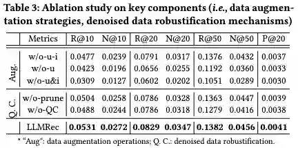 消融实验主要针对数据增强和去噪两个部分。w/o-u-i在消去LLM增强的u-i边的情况下,结果显著下降。这表明LLMRec通过包含上下文知识增加了潜在的监督信号,从而更好地把握用户的偏好。由w/o-u则可观察出移除被增强的节点特征会导致性能下降,这表明去除嘈杂的隐式反馈信号的过程有帮助。消融实验说明了该工作所设计的基于LLMs的数据增强方法。
