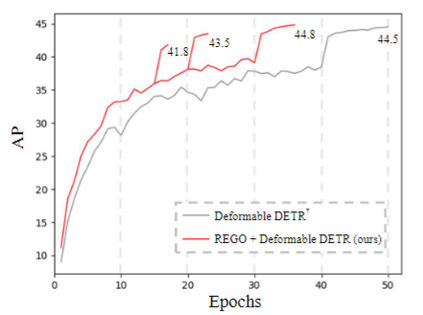 我们在图4展示了更详细的目标检测实验效果比较。我们对比了改进后的原始Transformer检测器(DETR)以及最新的Transformer检测器(Deformable DETR)在是否使用我们提出方法(REGO)的情况下得到的检测效果。从实验结果中,我们可以看到,我们的方法能帮助原有方法在36圈训练周期里得到和原来50圈训练周期相当水平的结果。同时,我们的方法也能在50圈训练周期里得到大致相对5%的检测精度提升。同时,我们的方法仅仅引入了较少的计算复杂都和参数量。