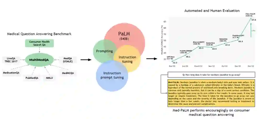 提出一个涵盖医学检查、医学研究和消费者医疗问题的医学问答benchmark:MultiMedQA。这是一个由七个医学问答数据集组成的基准,包括六个现有数据集和新引入的一个数据集。这是一个评估LLM临床知识和问答能力的多样化基准,包括多项选择题、需要对医疗专业人员的问题进行较长格式回答的数据集,以及需要对非专业人员可能提出的问题进行较长格式回答的数据集。本文还提出了一个医生和非专业用户评估框架,从多个维度来评估LLM性能。