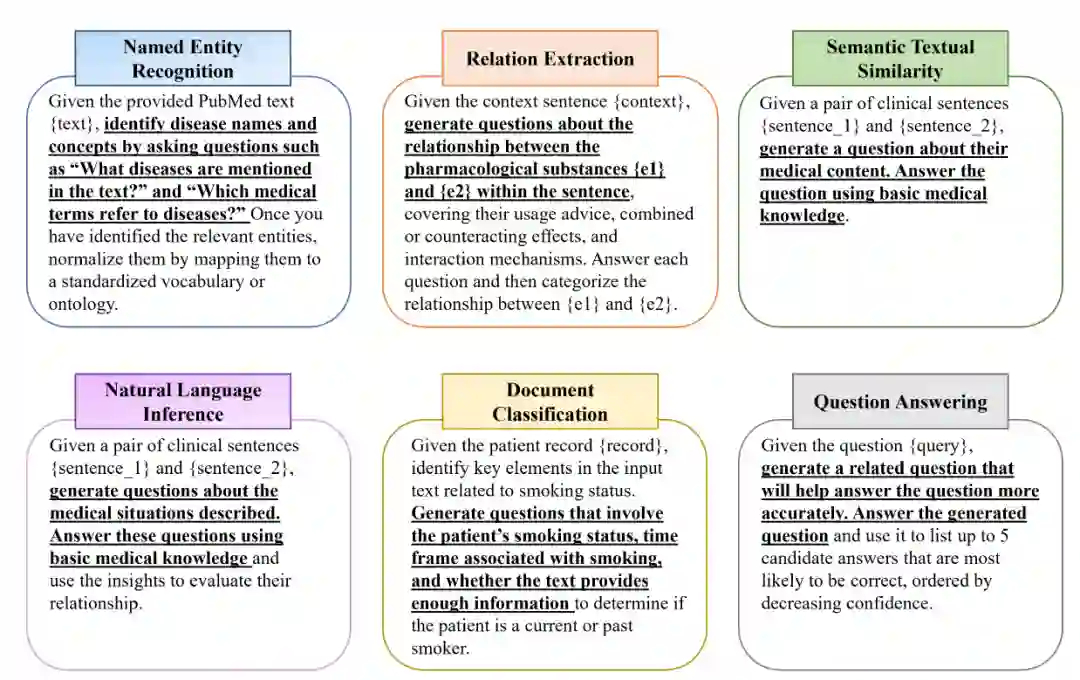 下面展示了六个任务的SQP模板,每个模板中突出显示了核心的自我提问过程。这些带下划线和粗体的部分说明了 SQP 如何生成与任务相关的目标问题和答案,从而指导模型的推理。