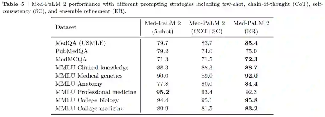 下表展示了Med-PaLM 2 在不同的提示策略下的性能。可以看出ensemble refinement改进了CoT和SC,从而促使策略在这些基准测试中获得了更好的结果。