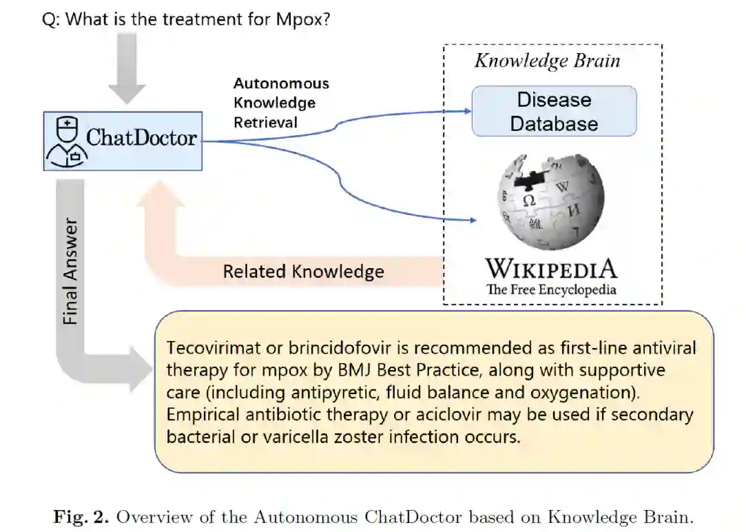 本文先通过Stanford Alpaca的数据微调以获得对话的能力,然后在收集的医学对话数据集上微调。为了测试基于知识大脑的ChatDoctor模型的能力,向该模型询问了一些最近的医学问题,例如上图中的Mpox(monkeypox,猴痘),由于这是一个新术语,ChatGPT 完全无法回答它,而 ChatDoctor 可以自主检索 Mpox 的维基百科内容并给出准确的答案。