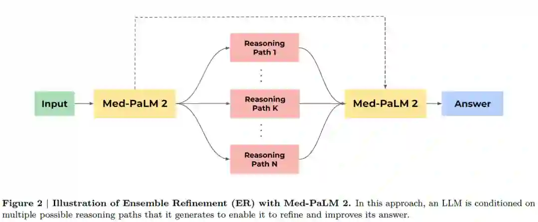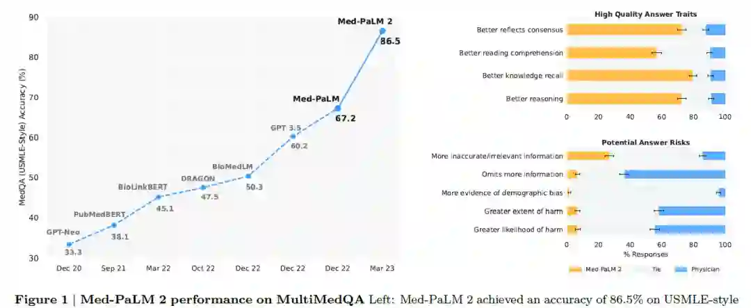 Towards Expert-Level Medical Question Answering with Large Language Models http://arxiv.org/abs/2305.09617 本文提出了Med-PaLM 2,是上面Med-PaLM工作的改进,它通过结合PaLM 2、医学领域微调和提示策略(包括一种新颖的ensemble refinement策略)来提升性能。Med-PaLM 2 在 MedQA 数据集上的得分高达 86.5%,比 Med-PaLM 提高了19%。
