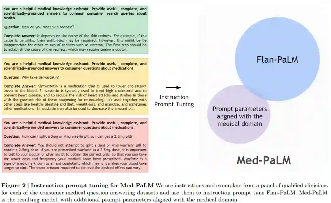 由于在生成长文本的数据集上,Flan-PaLM和临床医生的结果显示出一定gap。本文提出了使用Instruction Prompt Tuning对Flan-PaLM进行微调。使用soft prompt作为在多个医学数据集之间共享的初始前缀,然后是相关的特定于任务的prompt(由instructions和/或few-shot示例组成,可能是CoT)以及实际问题和上下文。通过随计选取和人工评估过滤,最终使用40个来自HealthSearchQA,MedicineQA和LiveQA的例子用于Instruction Prompt Tuning训练,得到Med-PaLM模型。