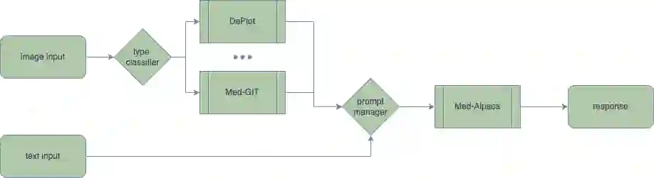 Visual Med-Alpaca: A Parameter-Efficient Biomedical LLM with Visual Capabilities 本文提出Visual Med-Alpaca,是一个开源的、参数高效的生物医学基础模型,可以与医学“视觉专家”集成以进行多模态生物医学任务。该模型建立在LLaMa-7B架构上,使用由GPT-3.5-Turbo和人类专家协作策划的指令集进行训练。利用几个小时的指令调整和即插即用的视觉模块,Visual Med-Alpaca 可以执行各种医学任务。 数据集构建:从 BigBIO 存储库中的各种医学数据集中提取医学问题,然后提示 GPT-3.5-Turbo 合成这些问题的答案,之后执行多轮人工过滤和编辑来优化问答对,从而产生包含 54k 指令的高质量指令集。 视觉模态:Visual Med-Alpaca 支持两个不同的视觉expert:Med-GIT 和 DePlot。Med-GIT 是一个用于图像到文本生成的模型,这里使用 ROCO 数据集进行微调,以促进专门的放射学图像字幕生成。DePlot可以将图形或图表的图像转换为表格,其输出可以直接用于提示预训练的大型语言模型。 由于基础模型提供了一个模块化且适应性强的框架用于整合各种视觉模块,在此框架内,任何多模态的任务都可可以分为两个基本阶段:图像到文本的转换和基于文本的推理。在本文中,视觉专家(即视觉基础模型)将医学图像转换为中间文本表示,然后将转换后的数据用于提示预训练的 LLM,利用 LLM 固有的推理能力来生成适当的响应。 Visual Med-Alpaca 通过提示增强方法连接了文本和视觉模态。首先,图像输入被送入类型分类器,选择对应的视觉模型后得到文本输出,然后将其附加到文本输入以用于后续推理过程。然后,prompt manager将从图像和文本输入中提取的文本信息合并到 Med-Alpaca 的prompt中,之后再进行文本的推理产生输出。