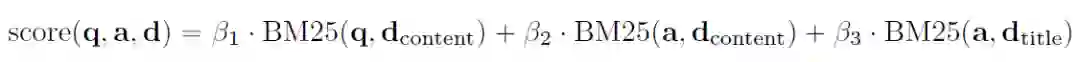 Retrieval augmentation探究了将模型与额外的上下文联系起来是否可以提高回答的准确性,使用BM25检索器和维基百科作为知识库。给定一个问题 、一个答案选项 ,对文章 进行检索: