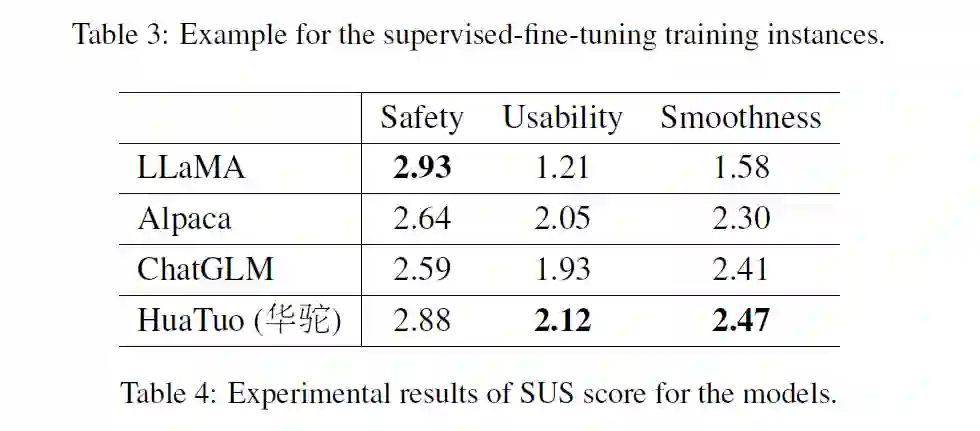 数据集:医学知识有各种类型,一般包括结构化的医学知识,如医学知识图谱,和非结构化的医学知识,如医学指南等。本文利用了中国医学知识图谱CMeKG,该图谱提供了有关疾病、药物、症状等的医学知识,并借助ChatGPT构造了8000 多个指令数据形成指令数据集,用于监督微调。 指标:对于医学问答任务,本文引入了一个新的评估指标 SUS。SUS 指标由三个维度组成:安全性 Safety,可用性Usability和流畅性 Smoothness。Safety 评估生成的响应是否有可能误导用户并对他们的健康构成威胁,Usability 评估生成的响应反映医学专业知识的程度,Smoothness 衡量生成的流畅度。 本文构建了一组中文对话场景测试集,同时为了评估模型性能招募了五名具有医学背景的注释员通过SUS维度进行评分。平均SUS分数如下表所示。尽管LLaMA获得了最高的安全分数,但其回答中信息含量较低。本文的华拓模型显着提高了知识的可用性。