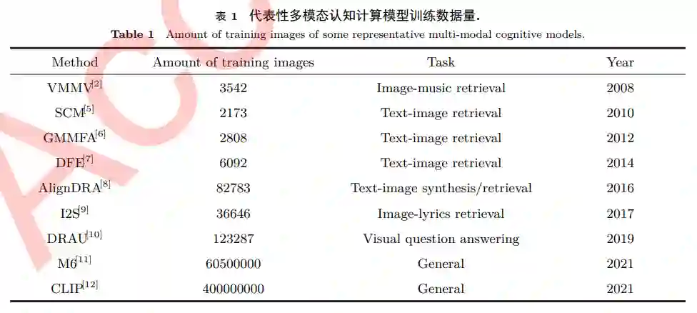 近年来, 注意力机制在计算机视觉, 自然语言处理等领域的广泛应用, 证明了对特定事件的关注 有助于提高机器的学习能力, 而多模态学习的成功也印证了多模态时空数据联合方面的优势. 因此, 公式 (4) 中的模型可以尝试解释多模态认知计算的内在机理, 刻画机器从数据中提取信息的过程. 然而, 是否获取到的信息量越大, 机器就越接近人类的认知水平? 当前, M6[11] , CLIP[12] 等通用多模 态学习模型已经在特定任务上取得了接近于人类的效果. 如表1所示, 这些模型往往需要千万级的训练数据, 与人类认知能力还存在很大差距. 将单位数据的信息提供能力定义为“信容”(Information Capacity)[13] , 与此对应, 机器的认知能力即为从单位数据获取最大信息量的能力: