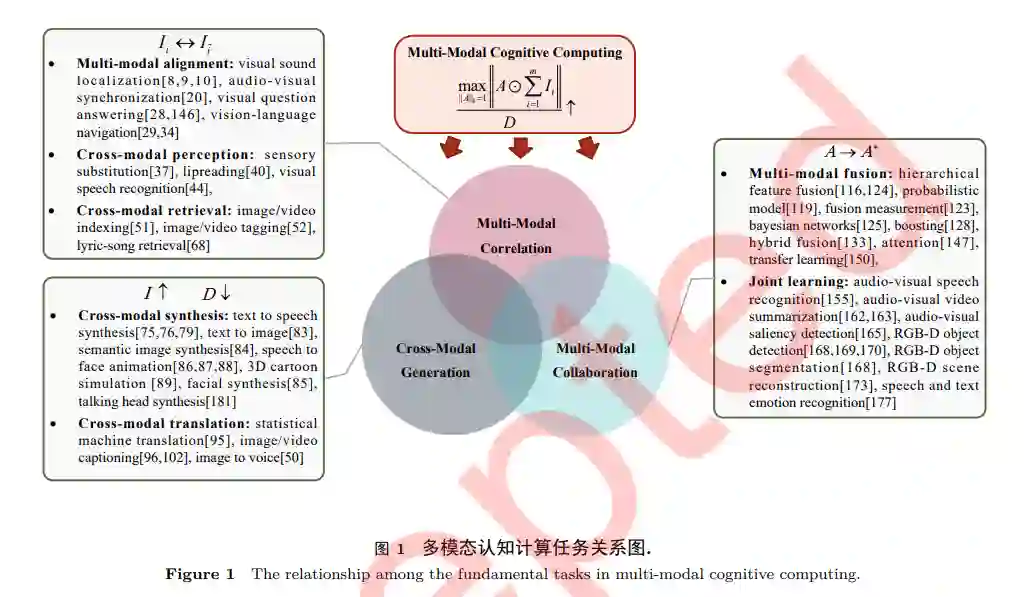 日常生活中, 人类至少利用视觉, 听觉等多种感官理解周围环境, 通过整合多种感知模态, 形成对事件的整体认识. 为使机器更好地模仿人类的认知能力, 多模态认知计算模拟人类的“联 觉”(Synaesthesia), 探索图像, 视频, 文本, 语音等多模态输入的高效感知与综合理解手段, 是人工 智能领域的重要研究内容, 也是实现“通用人工智能”的关键之一. 近年来, 随着多模态时空数据 的海量爆发和计算能力的快速提升, 国内外学者提出了大量方法, 以应对日益增长的多样化需求.**然而, 当前的多模态认知计算仍局限于人类表观能力的模仿, 缺乏认知层面的理论依据. 本文从信 息论角度出发, 建立了认知过程的信息传递模型, 结合信容 (Information Capacity) 概念, 提出了 多模态认知计算能够提高机器的信息提取能力这一观点, 从理论上对多模态认知计算各项任务进 行了统一. 进而, 根据机器对多模态信息的认知模式, 从多模态关联, 跨模态生成和多模态协同这 三个方面对现有方法进行了梳理与总结, 系统地分析了其中的关键问题与解决方案. 最后, 结合当 前阶段人工智能的发展特点, 重点思考多模态认知计算领域面临的难点与挑战, 并对未来发展趋势 进行了深入分析与展望。