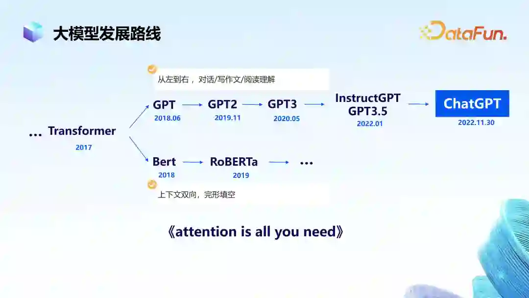 大模型的发展包括两条技术路线,一条是 OpenAI 为代表的 GPT 路线,一条是以谷歌为代表的 Bert 路线。这两条路线,一个是所谓单向的,一个是所谓双向的。从去年开始,两条路线已经分出胜负。(5)大语言模型登顶 NLP 的深层原理****让我们从 NLP 的角度来看一下,大模型都做了什么事情,解决了哪些问题。