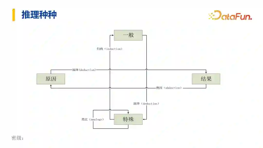 而在自动化的过程中,推理可以进一步分为两类,一类推理是描述特殊和一般的关系(上图中的纵向),包括归纳(从特殊到一般)、演绎(从一般到特殊)和类比(从特殊到特殊)等;另一类推理则描述原因与结果的关系(上图中的横向),从原因到结果的推理是正常的演绎路径,而从结果到原因的推理则是溯因路径。(2)逻辑****