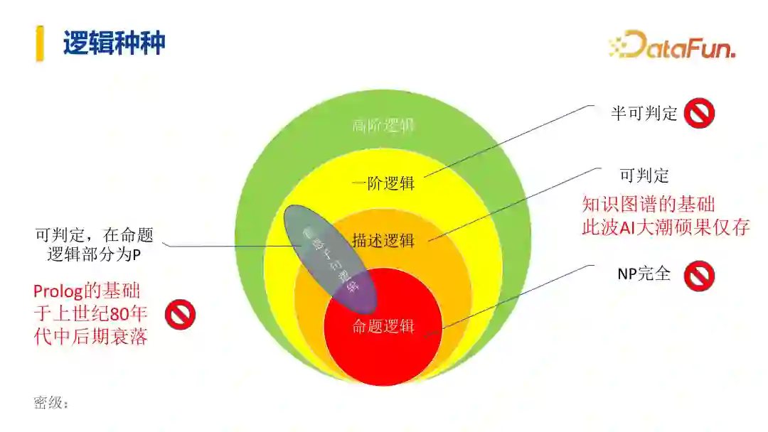 基于上述多种推理方式,为了研究、描述并实现这些推理,人类提出了各种逻辑系统。有的逻辑系统过于庞大,如上图的霍恩子句逻辑。日本曾试图基于该逻辑开发第五代计算机,但最终失败了,原因之一就是该逻辑系统与现在主流的计算机体系架构并不完全兼容,日本试图另起炉灶,但未能成功。在逻辑推理中,上图中间橙色的圈是描述逻辑,也是现代知识图谱的基础。