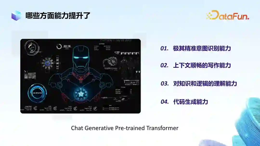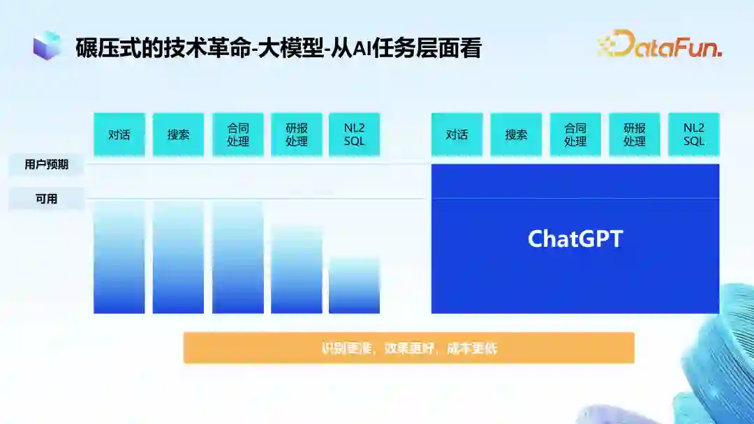如上图左侧,在大模型出现之前,很多场景都有分散的、独立构建的 AI 系统,使用小模型用相应的标注数据进行训练,然而总体还是不够理想,距离预期还有一定的差距,并且不同的任务也呈现出不同的状况。到了以 ChatGPT 为代表的大模型面世之后,我们看到了另外一番景象,即无需要进行大量重复训练,而是提前做好预训练,无需针对不同的场景开发烟囱式的系统,仅通过预训练模型经过少量精调就可以适应不同任务,并且效果往往会超预期。(3)哪些方面能力提升了****