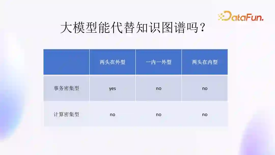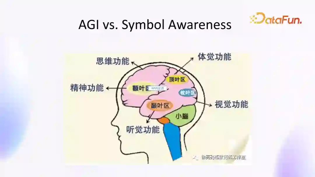将事务密集型模式和计算密集型模式结合起来,同时考虑数据来源和数据去向,对应用场景进行分类,会形成上表这种 2*3 的分类方式。这 6 类应用场景,其中只有事务密集型且“两头在外”的这类应用场景可以使用大模型来替代,其余 5 类场景则无法使用大模型完全替代。因此,知识图谱在很多场景下还是不可或缺的。 4. AGI vs. Symbol Awareness