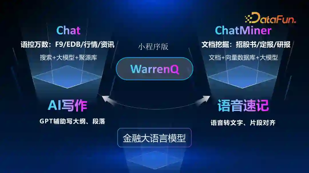 Q&A******Q1****:金融大模型有哪四个典型应用场景?****A1:金融大模型主要应用于投顾、投研、运维、合规这四大场景。Q2:金融大模型率先落地哪个场景?**A2:笔者更加看好投顾和投研这两个场景。对于投顾场景,需要对活数据的综合使用能力。而活数据的使用也是有“厚度”的,常常需要基于活数据进行常见问题的提取和加工,以及高频指标的计算等,需要使用大模型提高信息加工效率,因此投顾这一场景具有较好的发展前景。而对于投研场景,作为金融工程的基本能力的延展,其价值不局限于研究所,而是将其赋能到资管、风控等领域,其面向对象也不局限于分析师,而是将其辐射到一级市场的投行业务,甚至可以进一步延伸到实体经济的竞品分析、竞争态势分析等业务。综上,笔者看好投研、投顾这两个场景,认为在这两个场景下大模型可以率先落地。以上就是本次分享的内容,谢谢大家。
