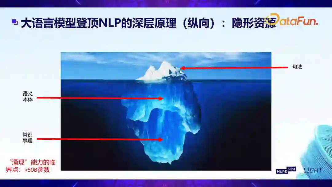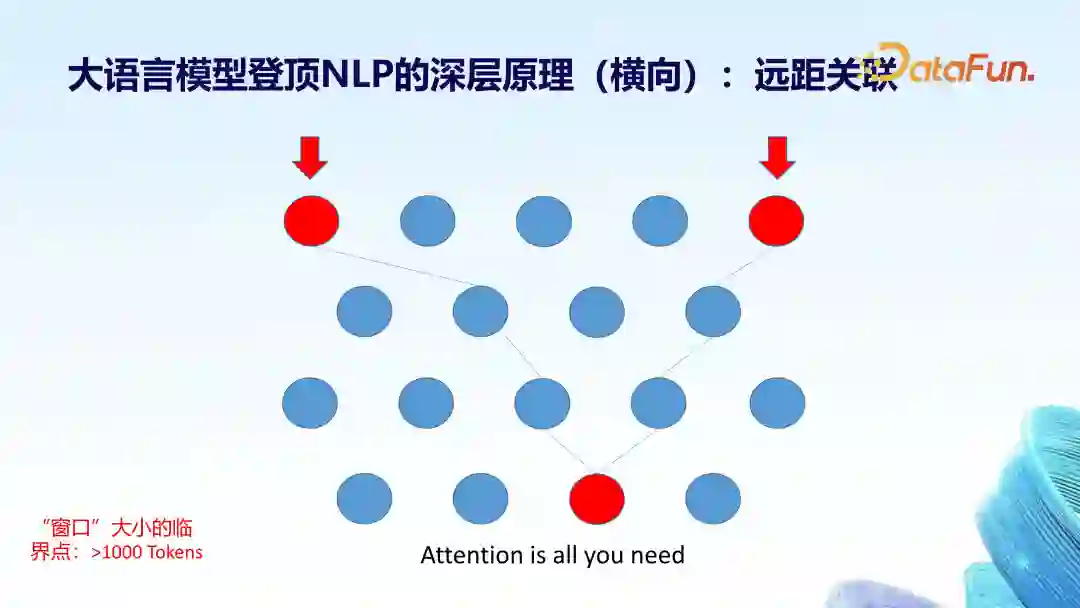 从横向看,大模型解决了 NLP 领域的一个难题——远距离上下文关联问题,即前文提到的一个词语或一段文字和后文的某一部分是相关的,然而两个词语中间的间隔可能很远,因此不同大小的窗口设定会带来不同的结果。实践发现,窗口设定的临界值大约在 1000 个 token 这样的量级,会给上下文关联的能力带来质变。因为这里会涉及前后文的 attention,即对窗口内的 token 进行大规模的计算,因此只有具备足够的算力支持,才可以把窗口延伸得足够远,才能够将前文的相关线索“抓取”出来并应用到当前文字的解读和生成上,从而有效地实现文本的远距关联,突破原先 NLP 技术路线下的瓶颈。