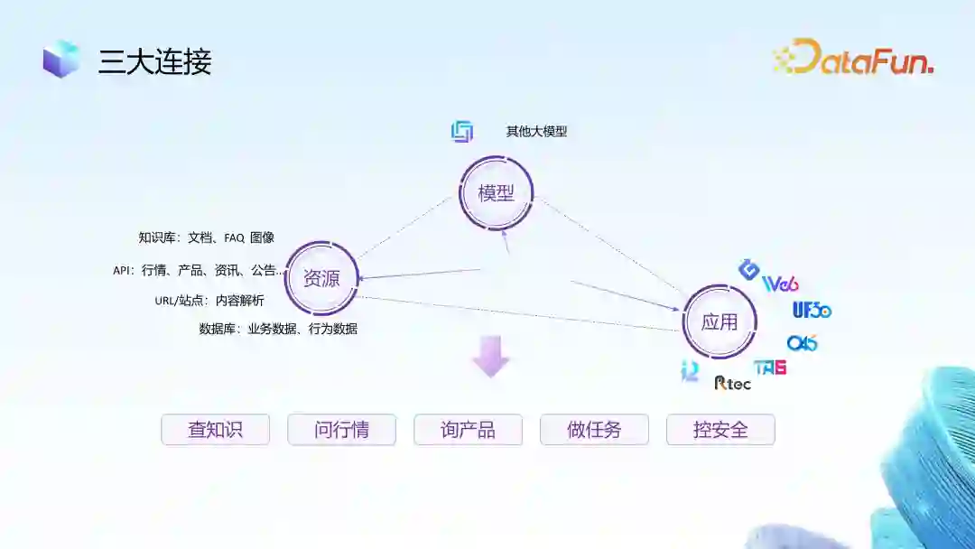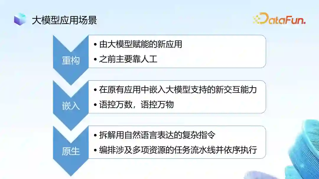 (1)重构重构,指的是大模型赋能新应用,即借助大模型打通相关的资源链路,将原先人工完成的任务通过大模型来完成。对于投研、投顾这类复杂的场景,仍然需要人工的参与,但是人工的工作负担会大大降低,效率会提高很多。而对于有些场景,是可以用大模型完全取代人的,例如呼叫中心接线员这类岗位,上岗前需要培训和考试,而考试的过程,一般是考官来模拟刁钻、脾气不好等各类奇葩的客户,考察接线人在这样恶劣情况下是否还能给出得体的回应。在这样的场景下,可以预设人设,让大模型独自来扮演考官这个角色,模拟这个挑剔的客户,对接线员进行考察。(2)嵌入所谓嵌入式,即在原有的应用中嵌入大模型 Copilot 副驾驶的能力,从而支持一种新的交互模式。例如传统的图形界面交互方式,可以通过大模型结合自然语言来实现,即透过菜单的层层点击一步到位地实现用户的功能,实现语控万数,进而语控万物。这样,不仅仅拓宽了应用场景,同时也拓宽了大模型的语义落地范围。(3)原生****原生,是近期各类 AI agent 的主要功能,即涉及多步操作的复杂指令,其中每步操作都会面向不同的外部资源,将外部资源进行拆解、编排、规划,确定执行顺序以及输入输出,将其形成任务流水线,进行通用化执行,最终得到结果。以上是大模型的三种常见应用场景,其中重构类型和嵌入类型相对简单,目前已有典型的落地场景案例。而在原生场景中,需要较强的任务拆解、任务规划、任务执行等能力,同时还要具备较强的语言理解能力、计算能力和资源对接能力,这是后面需要着重完善的地方。