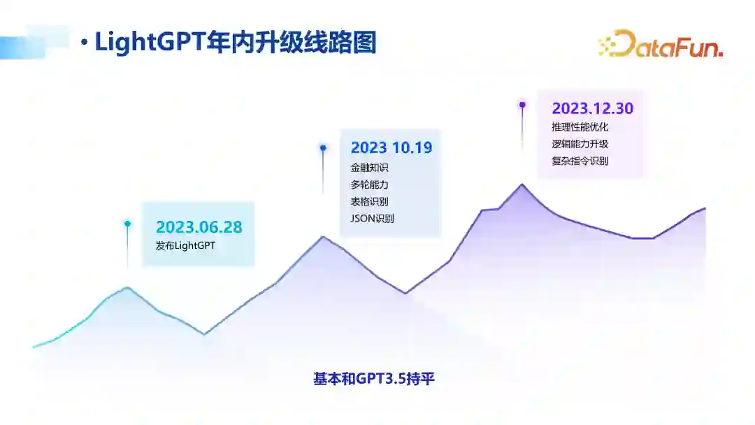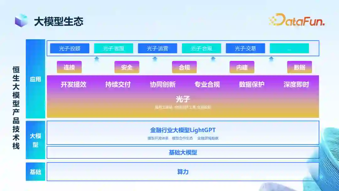 再次,为了降低推理的算力成本,2023 年 6 月实现了 LightGPT 的发布,即恒生版本的金融大模型,10 月 19 日开始公测,年底提供一些插件服务,包括推理性能的优化,以及复杂指令的逻辑能力等。 5. 恒生大模型——LightGPT