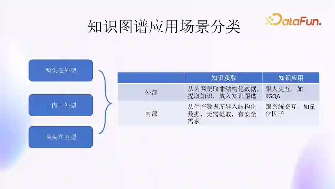 上图是知识图谱的技术栈,对此感兴趣的读者可以进一步了解。针对知识图谱在大模型时代是否会被淘汰这一问题,需要根据知识图谱的应用场景分情况讨论。(2)知识图谱应用场景分类****首先,要看知识的来源是内部还是外部;其次,要考虑知识图谱的应用对象是与人交互还是与系统交互。不同的应用场景,实际情况大不相同。根据这种组合方式,可以将知识图谱的应用场景划分为三个类别: