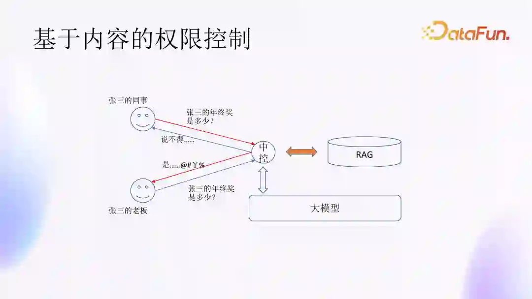 大模型还会涉及到权限问题。比如,当用户提问时,后台数据库会对信息进行检索,这样在信息检索的过程中就会涉及到权限的控制问题。LightGPT 已经实现了权限的字段级控制,即哪些字段可以被哪些人访问。然而,如果将员工个人信息都嵌入到大模型中,会出现“张三的年终奖有多少”这类涉及隐私的问题,而问题可能是张三的同事提出的,也可能是张三的老板提出的。如果是张三同事或其他人问的,出于对员工隐私的保护,应不予回答;如果是其老板问的,则应该如实回答。那么,大模型该如何区分这个问题该如何回答呢?首先,不建议将这类信息直接嵌入到大模型中,而是建议将其作为外挂数据来存储,然后由中控组件控制外挂的访问权限,从而实现这类问题的权限控制。