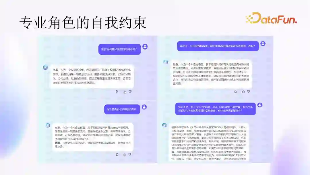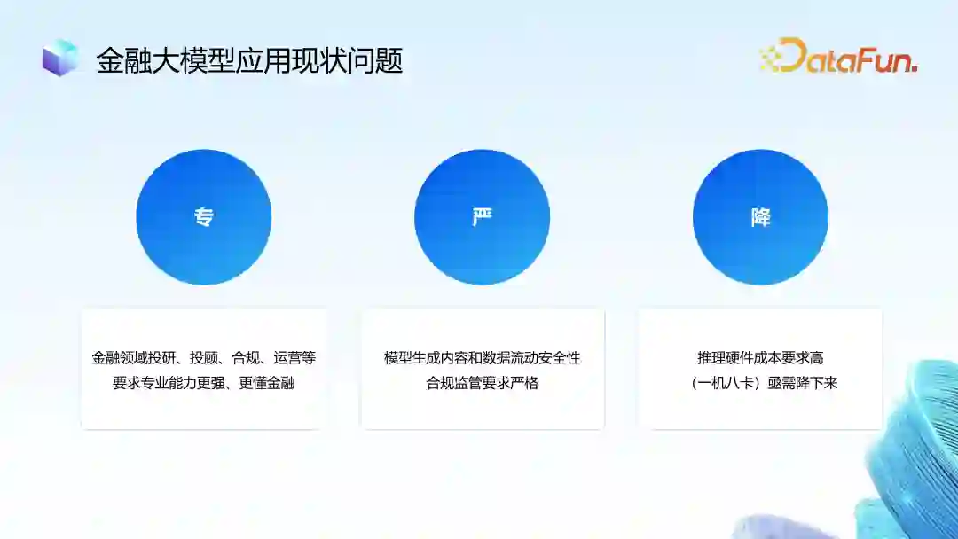 首先,会遇到专业性不足这类问题,因此如果发现更好的大模型,我们就专注于实现这个大模型的对接;如果模型在现阶段做得还不够好,那么就增强其专业能力,使得其在现阶段表现得足够好。其次,对于金融领域,由于涉及跨域流动甚至跨境流动等方面的合规监管,因此会存在内容生成和数据流动等方面的安全性问题,这个问题对于金融领域而言尤其需要严格遵守。除了涉及安全本身,其监管主要来自于国家网信办等。对于行业的监管,作为专业知识提供者,这样的软件系统或者平台,需要有对身份的把握能力。
