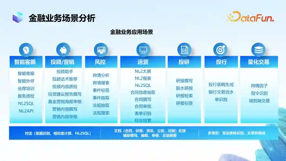 从纵向的角度看,不管是对文本的解读还是生成,整个过程中不仅仅使用了字面上的资源,同时还使用了很多深层的隐形资源,包括语义本体、常识事理等。前期有人尝试将隐形资源用人工方式进行形式化(比如 CYC),实践发现其效果非常不理想。大模型的引入,利用优质的文本资源(如教科书、百科全书等正规的、优质的书籍),正确地学习和使用语义本体知识以及常识事理知识,通过大量优质文本的训练,将知识及背后模式挖掘出来。当模型参数超过 500 亿时,往往会产生质变,出现一种涌现能力,而这种涌现能力也是和隐形资源的体量直接相关的。 2. 大模型在金融场景的实践**(1)金融业务场景分析******