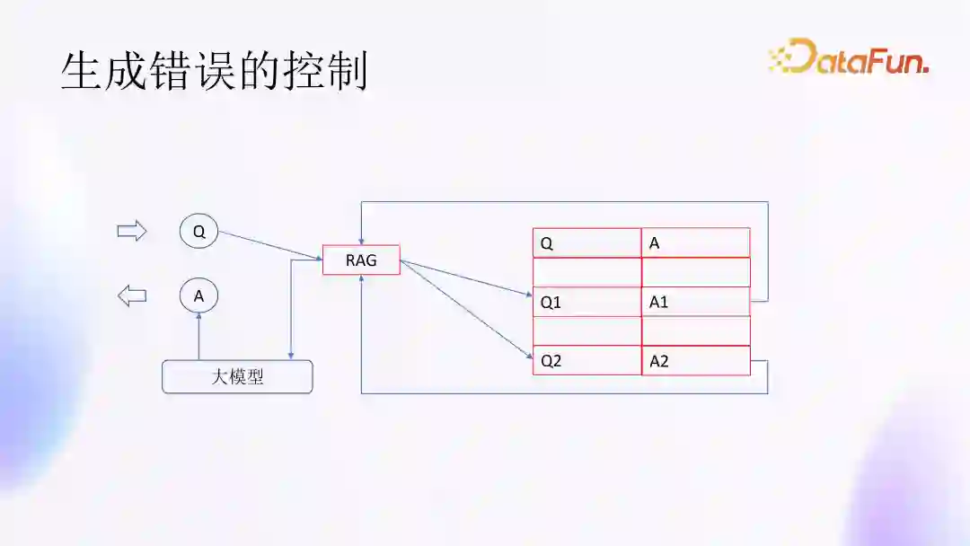 生成错误是非常常见的情况,尤其在问答的场景。这里有两种不同的技术路线:一种是将所有 FAQ 都输入到大模型进行训练,大模型在回答这类问题的时候,往往不拘泥于原 FAQ,而是进行一定程度的临场发挥,然而过度临场发挥可能会产生一些错误。因此建议使用另一种技术路线,即使用 RAG 来控制信息的检索和生成。RAG 是一种结合了检索和生成的模型,在生成回答时首先参考先前的标准问题和对应答案,进而挑选出最合适的答案,从而提高回答的相关性和准确性。具体来说,假如选择了 Q1,则对应的 A1 就是标准答案(同理,选择 Q2,则 A2 是标准答案),而不是将 Q1 和 A1 输入到大模型后,由大模型按照概率模型来生成,因为那样的生成结果容易不可控。