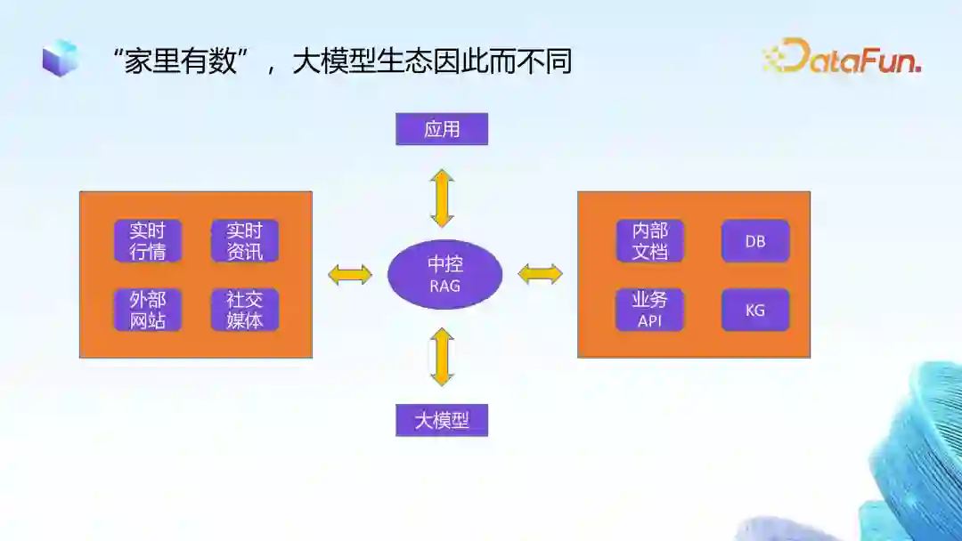 金融领域大模型的生态,和公有云上的生态有哪些不同?首先,金融大模型“家里有数”。所谓家里有数,一方面是金融领域有一些公开数据作为数据资产(当然,公开数据为保证其时效性,可能需要一些商业授权)。另一方面是金融机构自身的大量的私有数据、私有系统接口等。上图中,左边部分主要来自外部,而右边部分基本都来自企业内部,包括内部文档、内部数据库、内部知识图谱以及内部系统的开放接口等。大模型和应用之间会有一个以 RAG 为核心的中控,用来搭接外部数据和内部数据,起到“连接四面八方”的作用。 (2)恒生电子大模型生态蓝图****