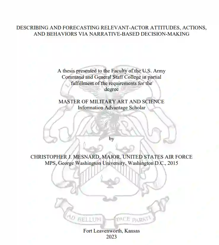 各级规划人员都在努力将当前状态过渡到更理想、更有利的状态。本研究探讨了通过使用可衡量的故事元素过渡到理想的未来状态这一主题,这些故事元素可以影响相关行动者的态度、行动和行为。故事是一种经过深入研究的认知过程,具有独特的元素,使规划人员能够在行动规划和评估中使用故事元素作为框架。此外,在本研究的发现阶段,研究发现了联合规划条令在如何描述叙事一词方面存在的理论空白。本研究的主要启示是,大脑会将故事及其元素按主题排列成叙事,这表明了一种认知过程,有助于个人理解现实以及逻辑上符合现实的可能决策。利用对故事及其元素的理解,规划者可以更好地描述和预测通过相关行为者的态度、行动和行为所表现出的基于叙事的决策。