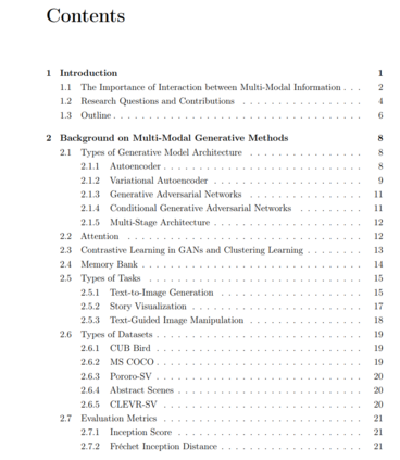 视觉感知是人类解释周围环境的最重要能力之一。每天,人类消耗的视觉信息量令人难以置信,他们观看视频、拍照、欣赏绘画以及在社交媒体上分享。例如,YouTube每天几乎有50亿视频被观看;仅Instagram每天就有超过9500万照片被上传。如此大量的视觉数据的可用性为研究人员提供了前所未有的机会来构建各种视觉解释和合成方法,如(1)物体/场景分类(He等,2016年;Simonyan和Zisserman,2014年;Szegedy等,2015年,2016年;Zhou等,2014年b),(2)物体检测(Girshick等,2014年;Long等,2015年;Ren等,2015年;Ronneberger等,2015年;Howard等,2017年;Redmon等,2016年),(3)图像描述(Donahue等,2015年;Xu等,2015年),(4)视觉问题回答(Andreas等,2016年;Johnson等,2017年;Lu等,2016年;Nam等,2017年;Antol等,2015年;Anderson等,2018年;Yang等,2016年),(5)文本到图像生成(Reed等,2016年b;Xu等,2018年;Zhang等,2017年a,2018年a),(6)图像到图像翻译(Isola等,2017年;Park等,2019年;Wang等,2018年;Zhu等,2017年),(7)文本引导的图像操作(Dong等,2017年;Li等,2020年a,c;Nam等,2018年),(8)故事可视化(Li等,2019年c;Song等,2020年;Maharana等,2021年;Maharana和Bansal,2021年)等等。这些方法旨在实现多模态表征之间的跨域转换,例如,将非视觉数据(如自然语言描述或场景图)转换成视觉信息(如视频或图像),反之亦然,并旨在实现它们之间的有效交互。 在这篇论文中,我专注于探索实现多模态信息(例如,语言和视觉信息)之间有效交互的原则,包括(1)如何在一个联合语义空间中为这些信息构建一致的表示,(2)如何有效地连接并融合来自不同模态的特征,以及(3)如何减轻计算需求以实现有效的交互。我的研究可以在许多领域启用无数潜在的应用,包括设计、视频游戏、艺术、建筑和医学诊断等等。