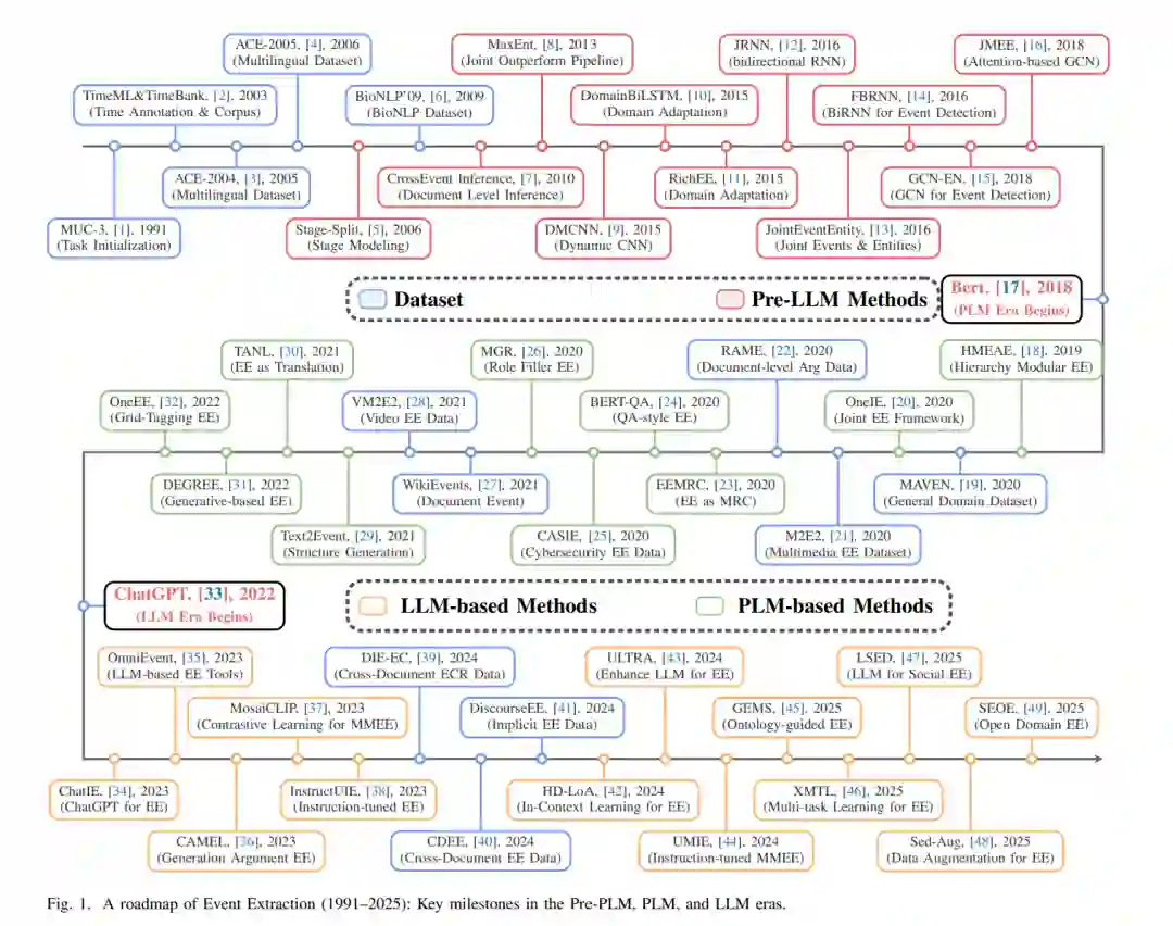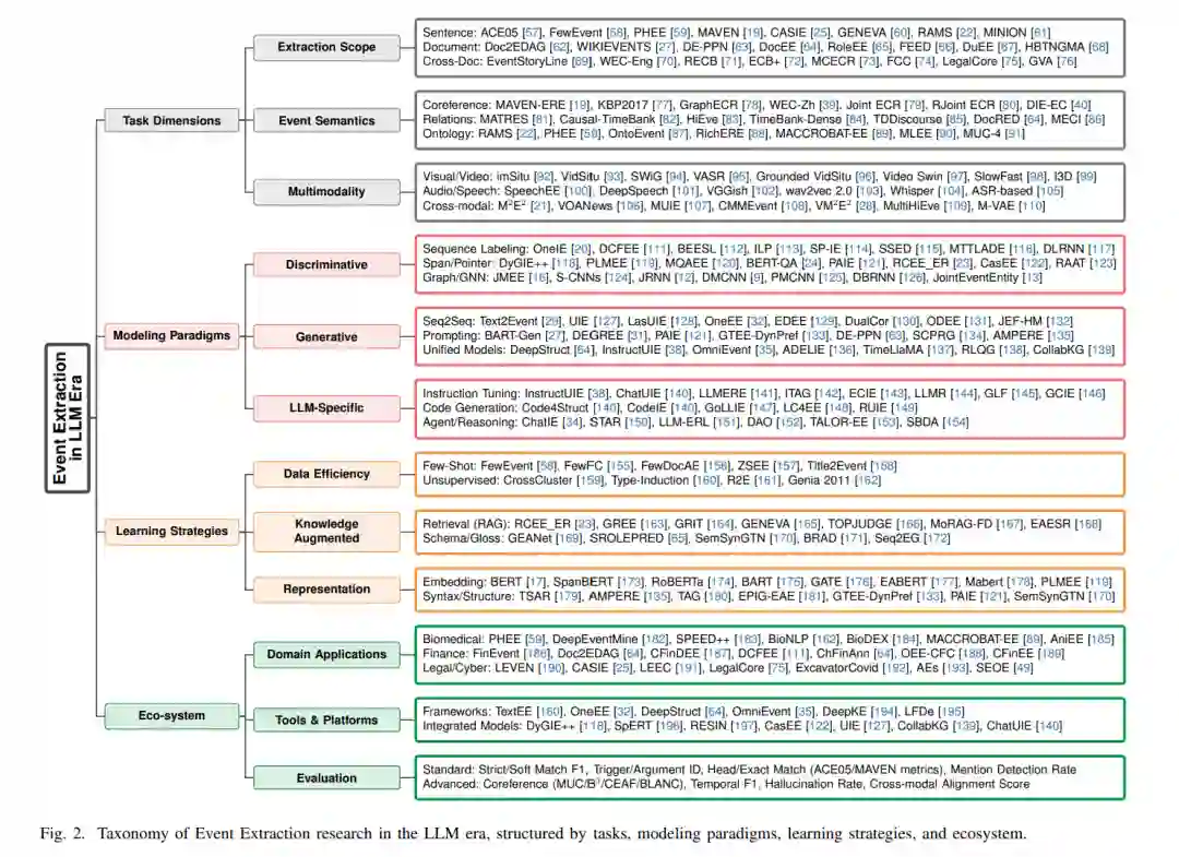 摘要—大语言模型(LLMs)及多模态大语言模型正在改变事件抽取(EE):提示与生成往往能在零样本或少样本设置中产生结构化输出。然而,基于LLM的流程面临实际部署的差距,包括在弱约束下的幻觉、长上下文及跨文档中脆弱的时间与因果关联,以及有限上下文窗口内受限的长程知识管理。我们认为,事件抽取应被视为一个系统组件,为以LLM为中心的解决方案提供认知支架。事件模式与槽位约束为知识落地与验证创建了接口;以事件为中心的结构可作为分步推理的受控中间表示;事件链接支持基于图谱的检索增强生成(RAG)实现关系感知检索;事件存储则提供了超越上下文窗口的可更新事件记忆与智能体记忆。本综述涵盖文本与多模态场景下的事件抽取,梳理了任务与分类体系,追溯了从基于规则与神经模型到指令驱动与生成框架的方法演进,并总结了形式化定义、解码策略、架构、表示、数据集与评估方法。同时,我们回顾了跨语言、低资源及特定领域场景,并强调了构建可靠事件中心系统的开放挑战与未来方向。最后,我们概述了LLM时代核心的开放挑战与未来路径,旨在推动事件抽取从静态抽取演变为面向开放世界系统的结构可靠、即插即用的感知与记忆层。